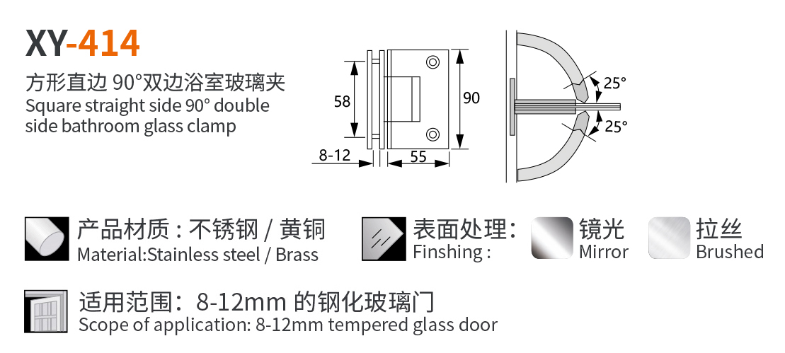 XY-414 方形直边 90° 双边浴室玻璃夹