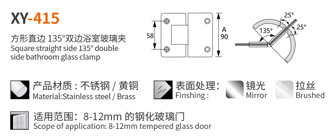 XY-415 方形直边 135° 双边浴室玻璃夹