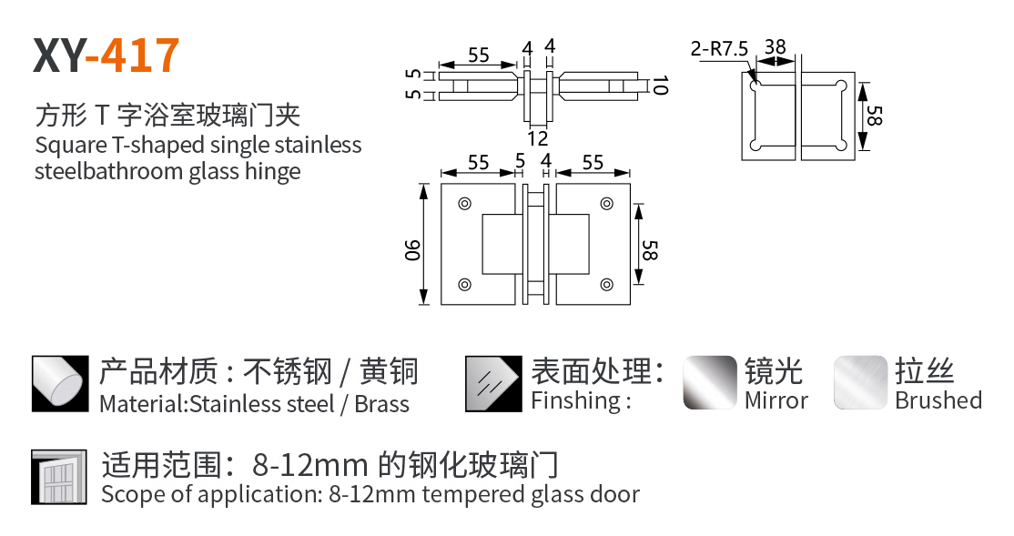 XY-416 方形直边 180° 双边浴室玻璃夹