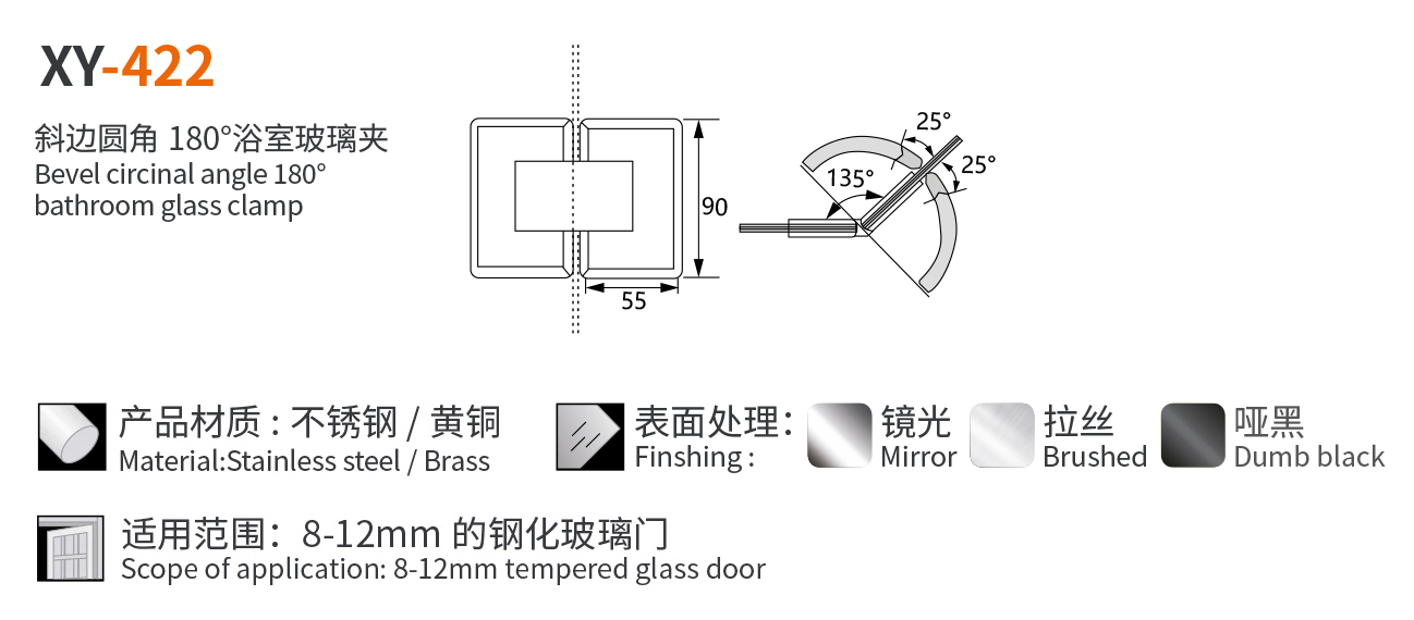 XY-422 斜边圆角 180° 浴室玻璃夹