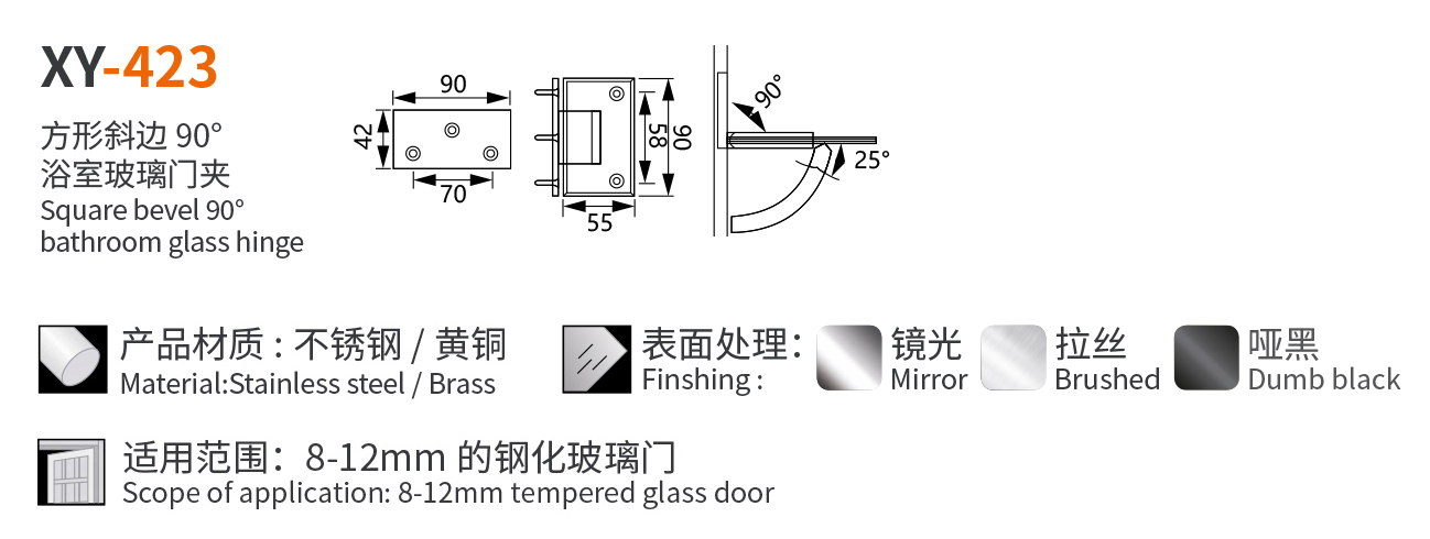XY-423 方形斜边 90° 浴室玻璃门夹